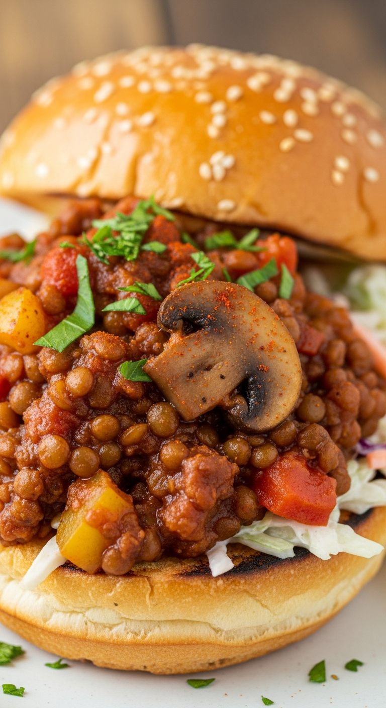 - Assemble Sloppy Joes: Spoon a generous amount of the lentil and mushroom mixture onto the bottom half of each bun. Top with optional garnishes like fresh parsley,pickles,or vegan slaw,then cover with the bun tops.