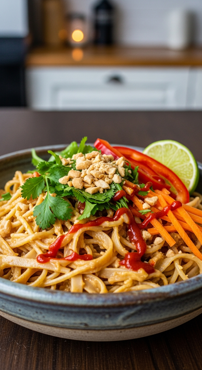 This savory Thai Peanut Noodle Bowl shines when presented in wide shallow bowls to showcase the colorful toppings. Serve chilled or at room temperature alongside a crisp green salad or steamed edamame for balance. Pair with a light Riesling or jasmine tea to complement the dish’s subtle sweetness and spice.