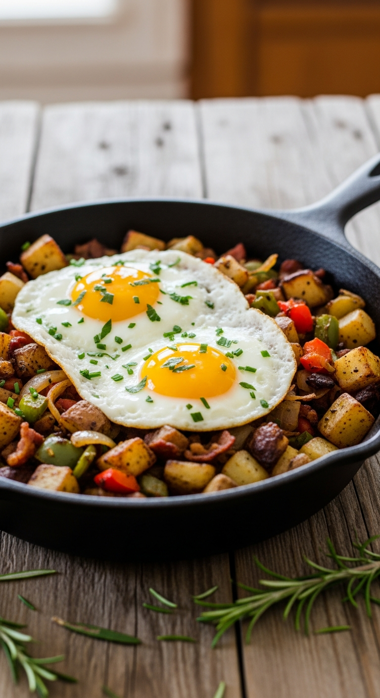- Create space for eggs: Carefully push the hash mixture to one side of the pan, adding the remaining 1 tablespoon olive oil to the cleared space. Crack the eggs directly into the pan and cook them sunny-side up or to your preferred doneness.