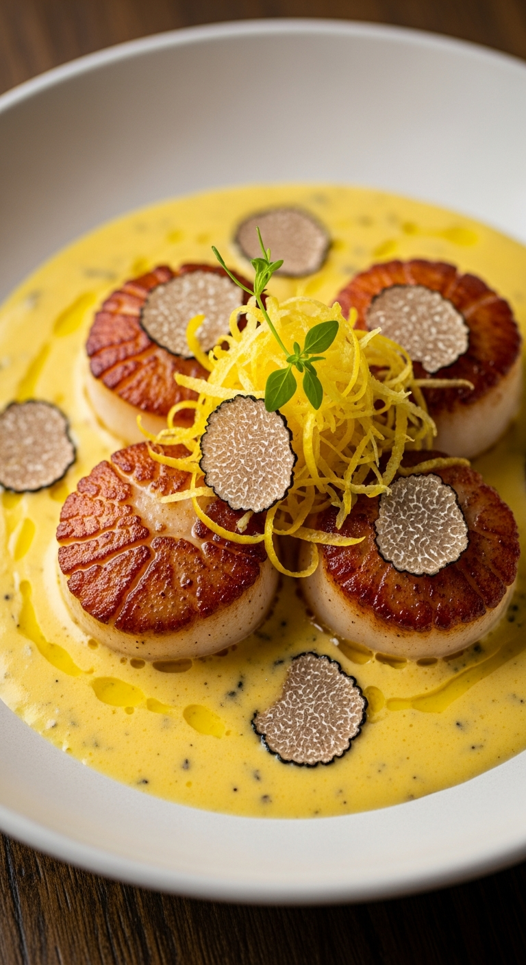 - Plate and serve: Spoon a generous pool of the zesty lemon truffle cream sauce onto warmed plates. Arrange scallops atop the sauce. Garnish with chopped fresh parsley and optional microgreens or edible flowers for visual elegance.