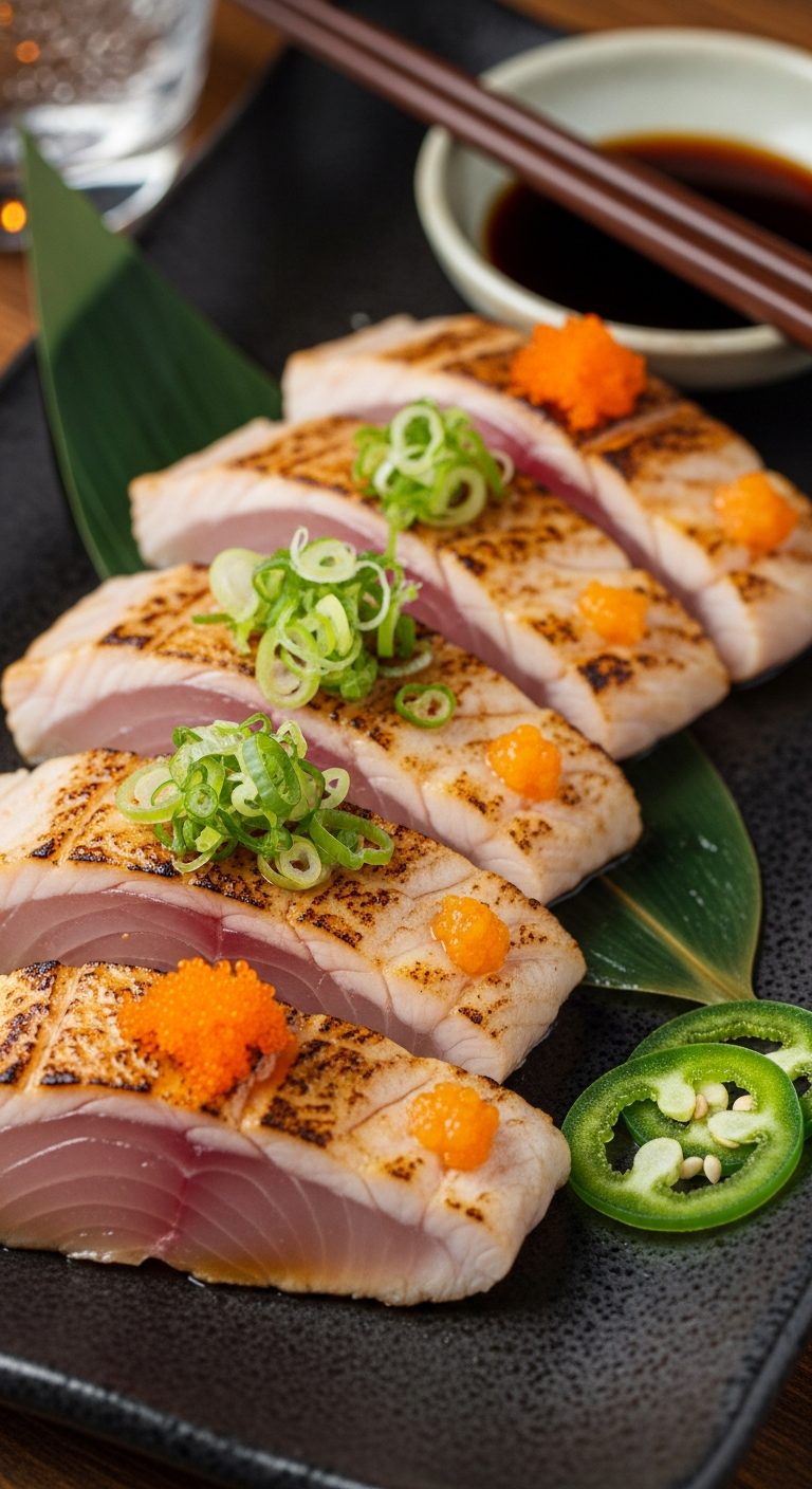 A4: Presentation should mirror the dish’s elegant simplicity.Thin slices of golden seared yellowtail arranged like a fan showcase the beautifully caramelized edges.A gentle drizzle of ponzu pools around the base, punctuated by microgreens, thinly sliced scallions, or delicate shiso leaves for freshness. A sprinkle of toasted sesame seeds adds a nutty crunch, while a small mound of grated daikon or pickled ginger offers a crisp contrast.