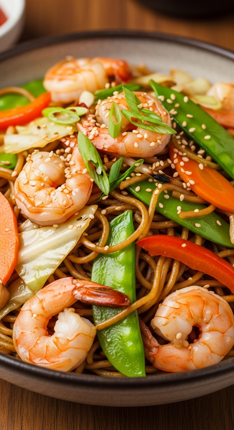 A4: Crisp, vibrant veggies like bok choy, snow peas, bell peppers, and shredded carrots add color and crunch. Their brightness contrasts beautifully with the savory shrimp and noodles, making each bite lively and fresh.