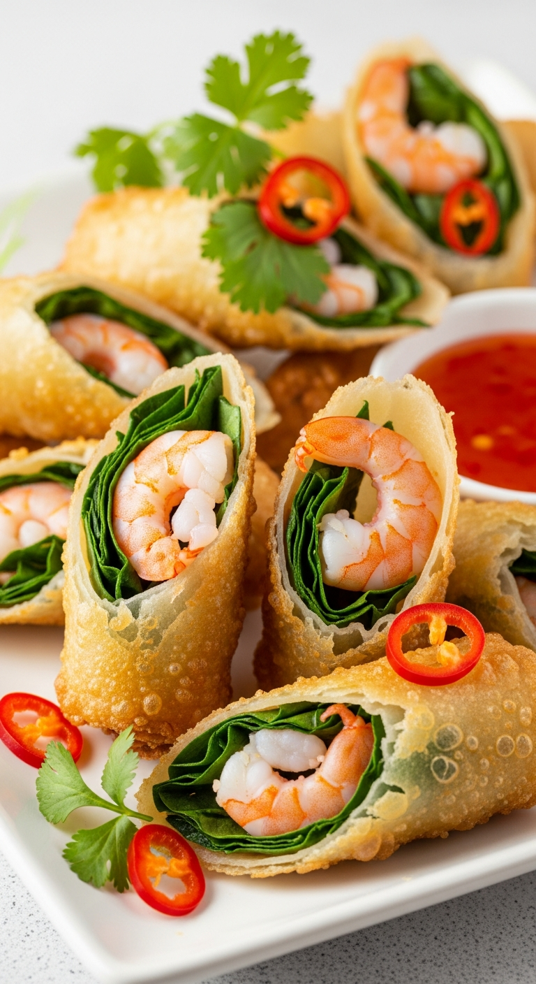 - Serve: Spoon a generous pool of the roasted red pepper cream onto each plate.Place 2-3 shrimp and spinach rolls atop the sauce.Garnish with fresh microgreens or a sprinkle of smoked paprika for visual contrast.