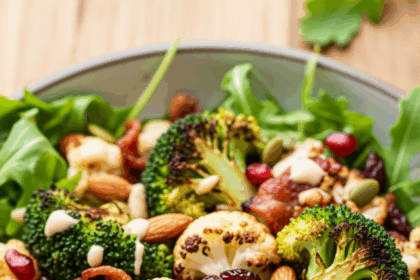 Discover the vibrant crunch of roasted broccoli and cauliflower in this salad…
