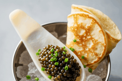 Elegance on a Plate: the timeless dance of silky caviar atop warm,…