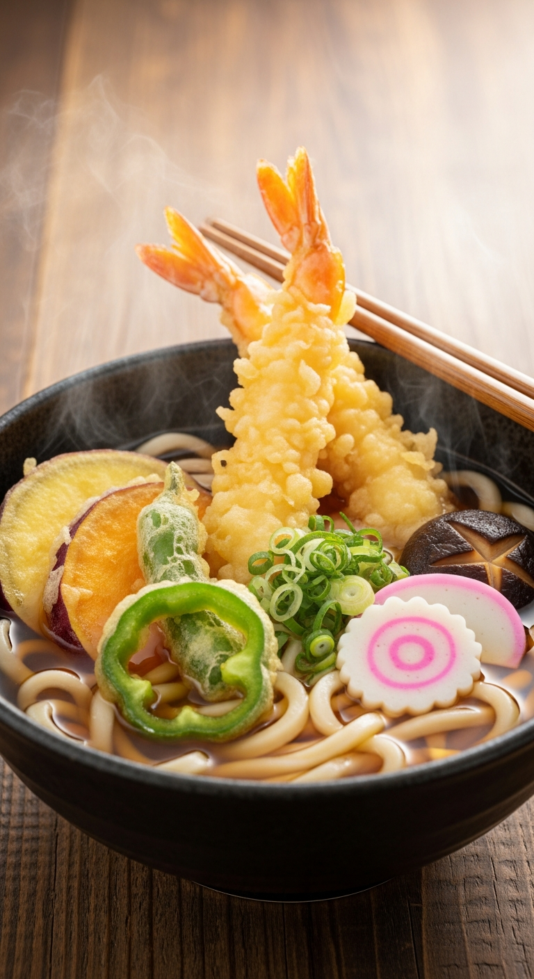 A: Tempura udon is a beloved Japanese dish combining two iconic culinary elements: thick, chewy udon noodles served in a savory, clear broth, topped with crispy, golden tempura. The tempura-usually shrimp or seasonal vegetables-is deep-fried to perfection, creating a delightful contrast in texture and flavor within each bowl.