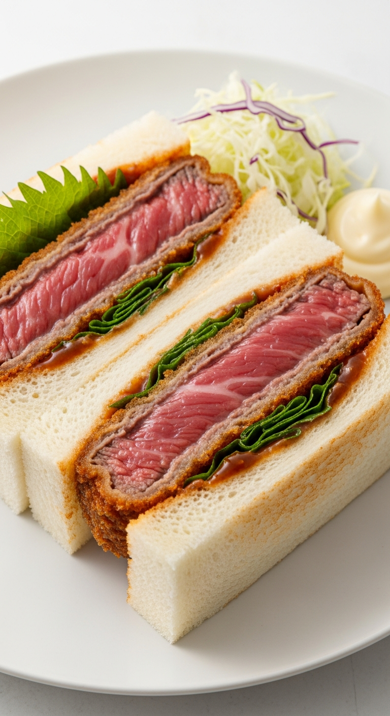 - Layer and serve: Place the Wagyu katsu on one bread slice, add thinly sliced cabbage if desired, and top with the second slice. Press gently and cut the sandwich in half diagonally for that classic presentation.